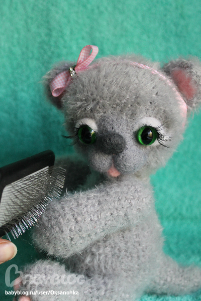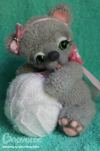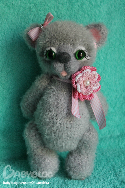 Игрушечный мир - животныеА у меня новая кошечка, Дымка, ласковая девочка. Кошечка связана из фактурной пряжи, 6 шплинтов, кошачьи глазки, мордочка и подушечки на лапках - сухое валяние, набивка -холофайбер, ростом 25см. Бантик на шее на ленточке, снимается.