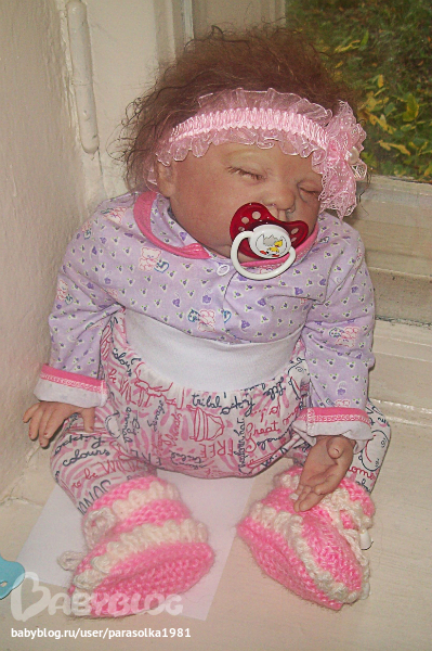 Очаровательная малышка! Для первого раза отличный результат! Я очень люблю малышей реборнов, у меня дома живет одна малышка. Немного критики: ну это на мой взгляд, без обид только))))), складочка над губой немного неестественно раскрашена, про ноготки уже говорили. А так очень хорошенькая малышка получилась! Вам надо еще нарядики для нее какие-нибудь более девчачьи найти. Свяжите ей платьишко какое-нибудь симпатичное, или комбезик. Браслетик на ручку с именем, заколочку-бантик и будет красотка, глаз не оторвать. Дерзайте, буду ждать ваших новых малышей! А Алинке-малышке желаю найти мамочку.