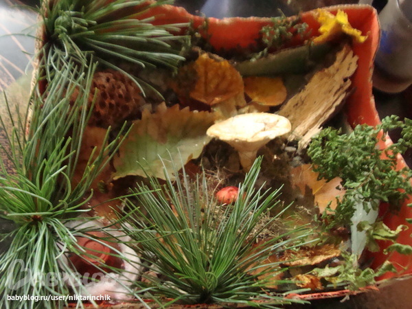 Поделки с детками.Вчера всем семейством выгуливались в ботаническом саду,откуда забрели в лес и бродили там часа 2.Дети были в восторге,и даже малой ни разу не попросился на руки!Я больше всего была заинтересованна дарами природы,и насобирала целый пакет "гербария".Домой вернулись жутко уставшие,голодные,но какие довольные!)На утро мы со старшим сообразили из наших "даров" вот такую осеннюю коробочку: