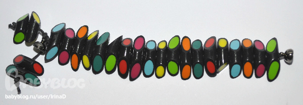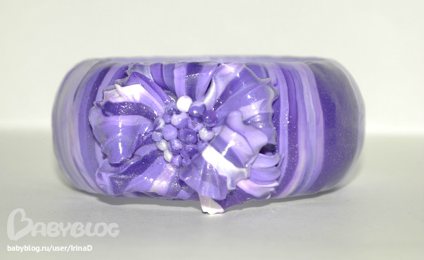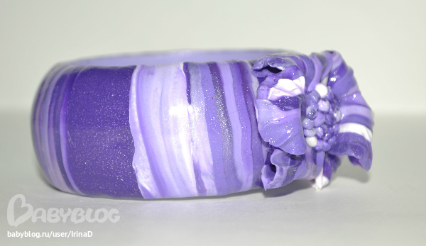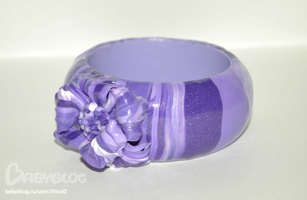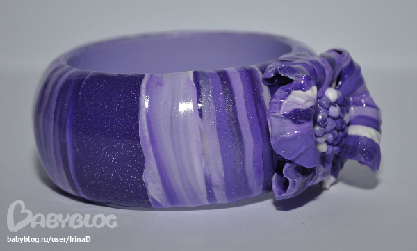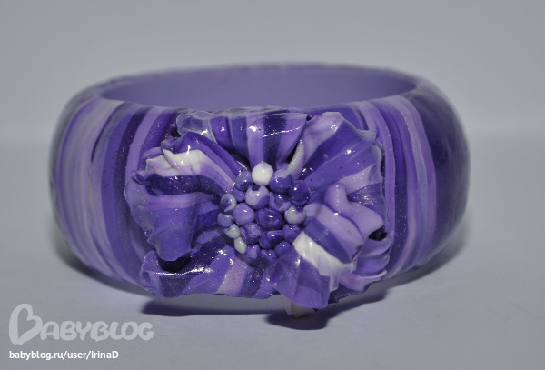Браслет. Делала к кольцу, но поняла, что основу браслета нужно было сделать из однотонной пластики. Цвет неправильный. На самом деле браслет яркого фиолетового цвета.