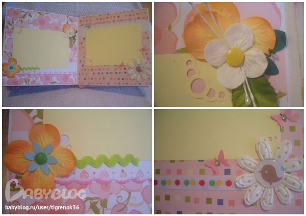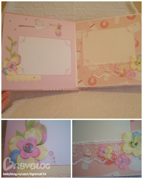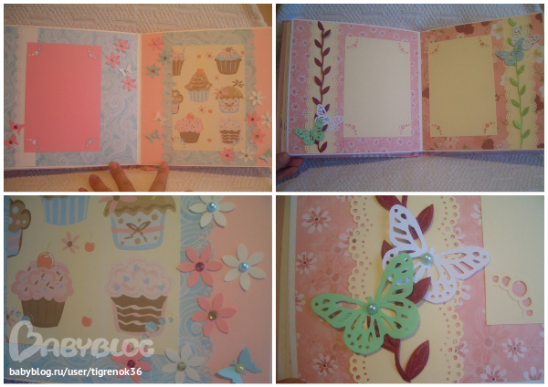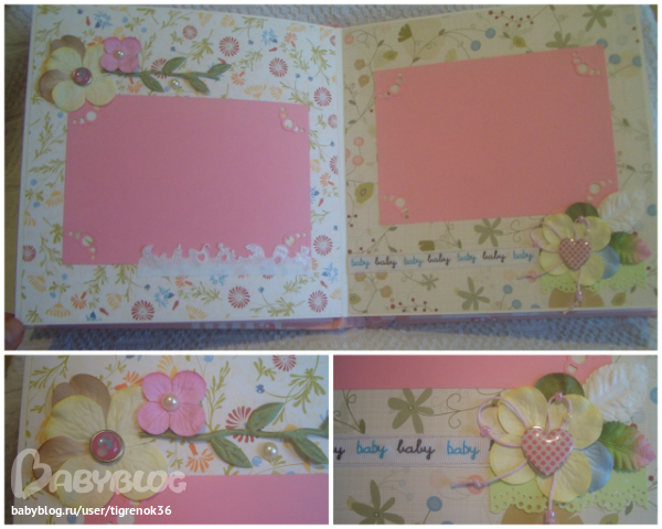 Лена, я по Вашей просьбе с критикой ))) В целом цветовая гамма приятная. Альбом смотрится нежно. Но, если присмотреться, все слишком пестро. Надо либо на спокойной бумаге использовать яркую декорацию, либо наоборот. У Вас получается, украшения спорят с фоном. Появляются лишние по колеру цвета (на страничке с красивыми розовыми цветами вдруг оранжевые да еще с голубым цветы, на другой страничке дырокольные листочки совершенно другого холодного цвета). Замечательные кексики, вдруг бац! на них букетик. Приходится разглядывать, что же это такое? Одно другое перебивает.Тесьма с надписью baby и на другой странице с кружочками совершенно невыигрышно смотрятся. Их просто не видно на фоне пестрой бумаги. Главное правило декоратора - использовать максимум три цвета (иногда четыре, часто два из них близки) плюс белый, черный, серый. Походите по блогам с заданиями. В Контакте часто втречаются предложения цветовых решений. Посмотрите цветовые сочетания. Цвета либо теплые, либо холодные. Вы нигде не найдете розовый, оранжевый, голубой и зеленый в одном замесе, да еще такие активные.