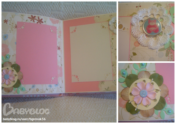 Леночка очень красиво нежно замечательно!!! Цветочек вязанный так мило смотрится!!! А можно МК такой формы альбома, уж очень хочется попробовать сделать не на кольцах.