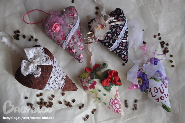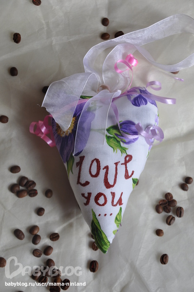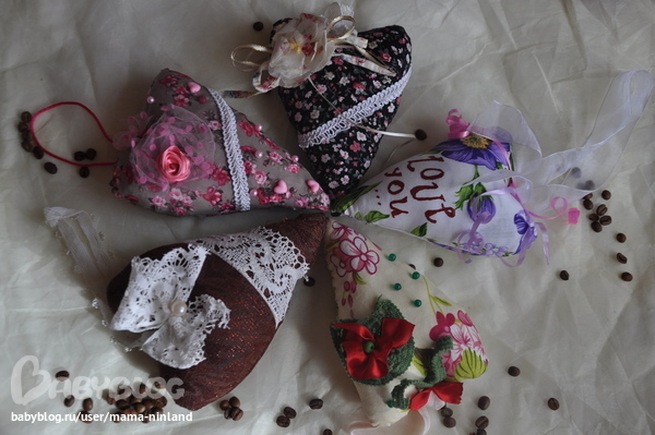 Началась у меня ммм сердцемания! Творим вместе с дочкой (дочка в этом чаще всего участвует косвенно, музицирует меня, так сказать))! Особенное - это белое с сиреневым! Дочка его шила сама на машинке (не считая верхушки, там сложные для неё изгибы), сама наполняла его (правда наполовину - но и это хорошо!) говорит: ""Подарю его братику на ДР!" "Надухарила" его своими детскими духами - "для аромату")) Завтра будет вручать - урря! Остальные не идеально ровные (холлофайбер закончился, а наполнить горелось - заполняли обрезками, реализовываем безотходное производство).