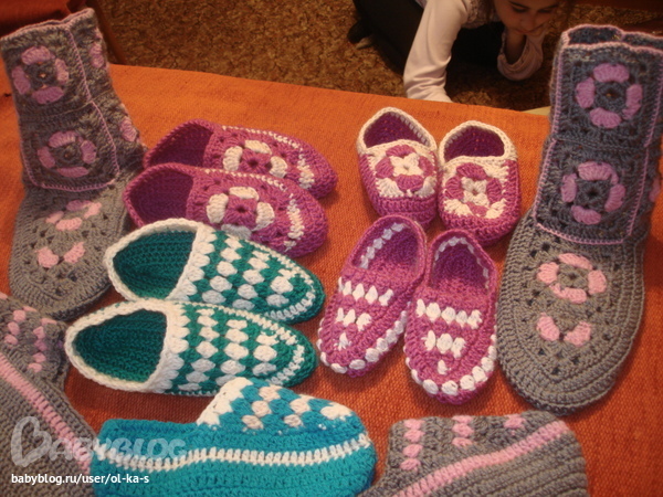 остальные связаны по тому же принципу, только в основе вязала не шашечки, а любой квадрат. сапожки связаны из головы по фото. навязала квадратов, сшила контрастной нитью (можно соединить крючком), и вязала подошву как у пинеток (а можно и пришить что-нибудь потолще)
