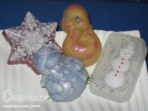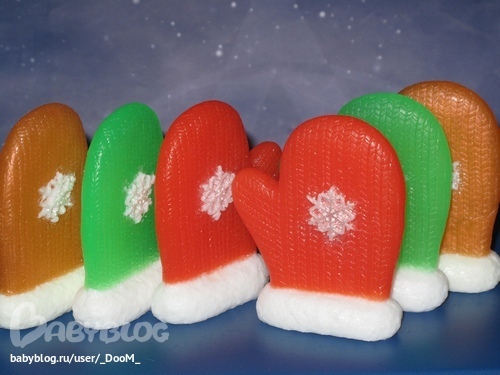 Ух ты, сколько наварила!!!! Какое великолепие! Розы чудесны, особенно когда их много. Я как -то такие розы в прозрачном мыле делала, смотрелись очень здорово, а потом потускнели, мигрировали цвета. У тебя как с этими розочками дела обстоят? И еще вопрос, чего это все взялись за новогодние мыльца? Кстати варежки классные!!!! Сама жду посылочку)))) ждите моих варежек!