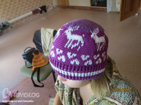 Спасибо0))перетяжки да есть и большие временами))) только когда уже связала шапку додумалась надо было вязать просто полностью фиолетовую а белой ниткой потом по схеме вышить оленей крестиком, было бы лучше))