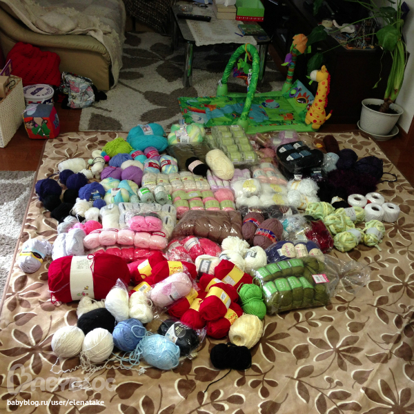Аппетитная кучка)))) У меня наверное столько же пряжи, тоже храню в ящиках под кроваткой ребенка( уже еле закрываются) Но , страсть к вязанию пока пропала, заболела вышивкой и теперь хомячу нитки , наборы и схемы))) р.s муж скоро выгонит наверно...