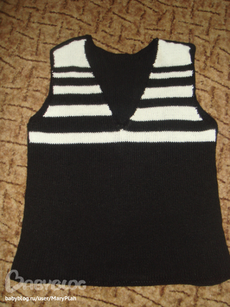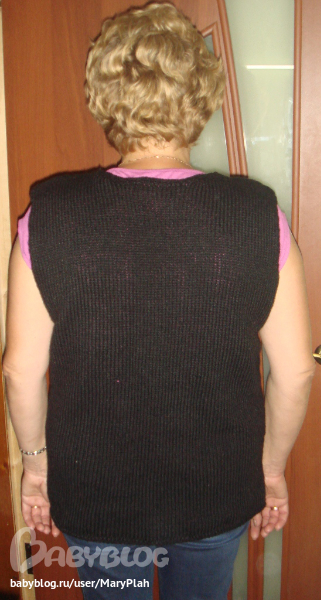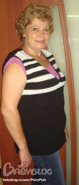 Хорошая жилетка))) Свекрови черно-белое очень к лицу. Но присоединюсь к предыдущему оратору - очень не хватает планочек-обвязок черных пошире (можно и крючком ст б/н повыше надвязать) - они бы придали законченность. Но главное, что свекрови понравилось)))