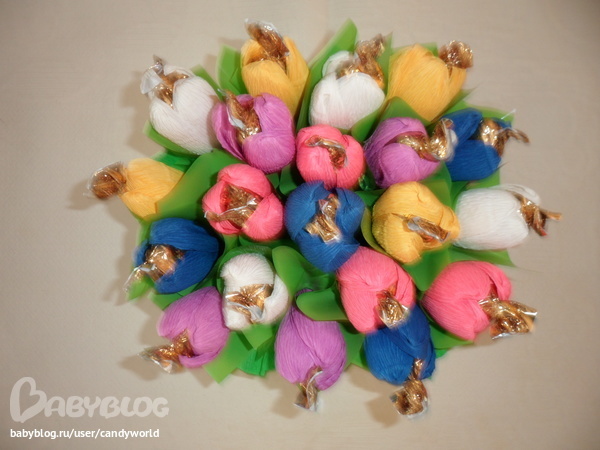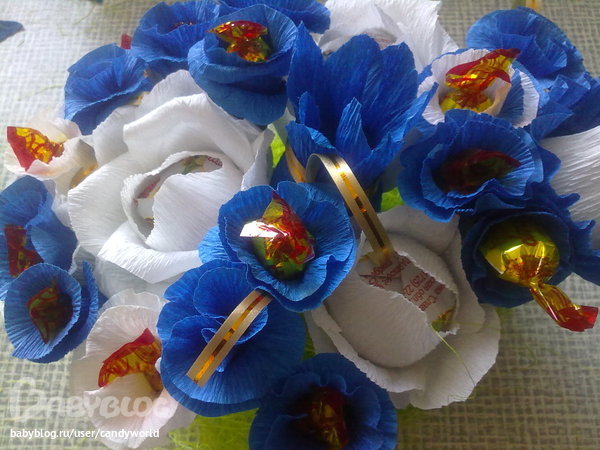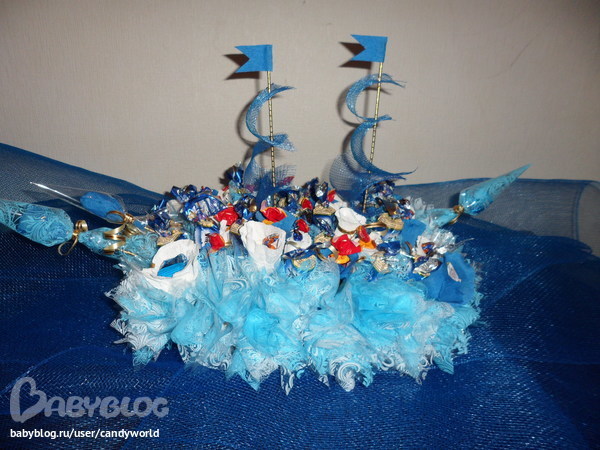 Для первых работ - супер. Кораблик издали клевый, только бы по ближе его посмотреть, а то не понятно что там в нем. Крокусы хорошие только старайтесь чтоб полоску на гофре разделяющую не было видно, ниже ее опускайте. Сине белый не плохой, но тоже не видно целиком оформление. Удачи в следующих работах.