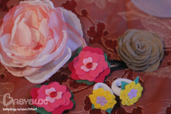 Заколочки, резиночки и брошки, Наташа их делала сама, а розу из шифона Наташа,как настоящая волшебница исполнила для меня, зная, что я о ней мечтаю))))