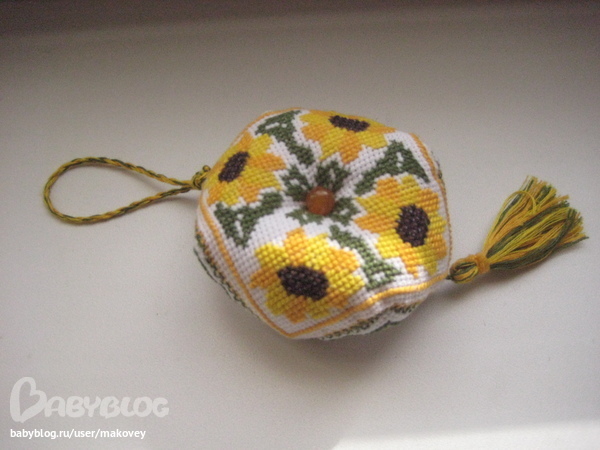 спасибо! вообще-то по сути это приятная безделушка. Можно подарить кому-то, можно использовать как игольницу или маячок для ножниц, я думала на елку на НГ повесить, т.к. сынуля еще очень маленький и елку буду украшать безопасными небьющимися игрушками. Пока-что висит эта штучка на окне на кухне, она мне "в тему" подсолнухов на кухне.