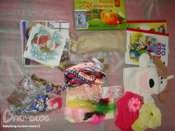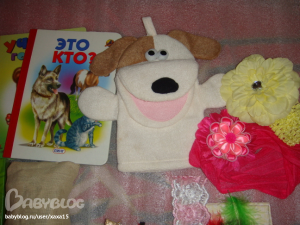 Для Ани прекрасные книги, классная мочалка-собачка, нереальной красоты повязочки на голову +брошь