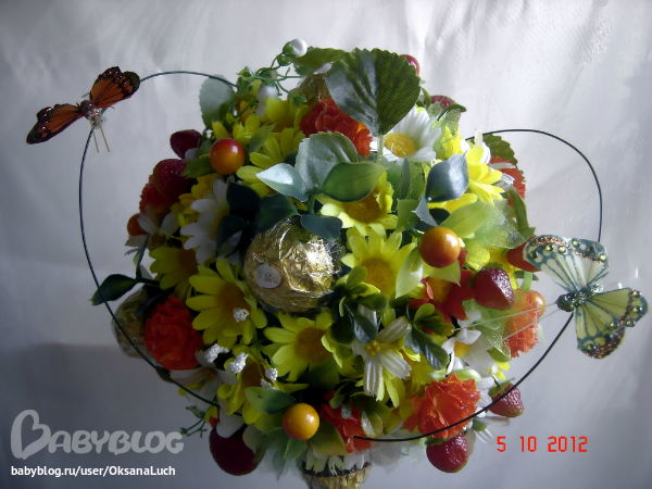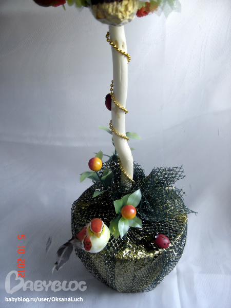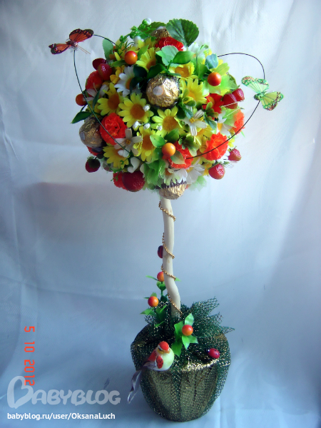Оксан, шикарный топиарий! Но на мой взгляд конфеток мало( Очень понравилось какбабочки парят вокруг.