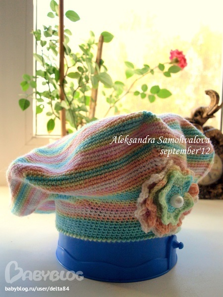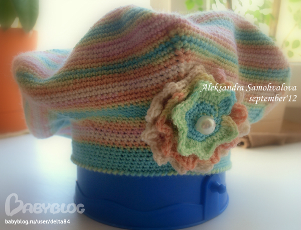 пряжа - ализе беби вул батик, тоненькая, но оч теплая и комфортная для ребенка! связала еще пару недель назад, да вот цветочек закончила только вчера... (просто расстроилась, что с размером промахнулась, вот и не заканчивался он у меня никак...)