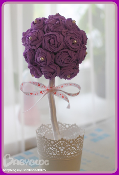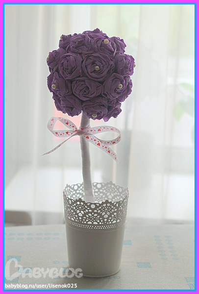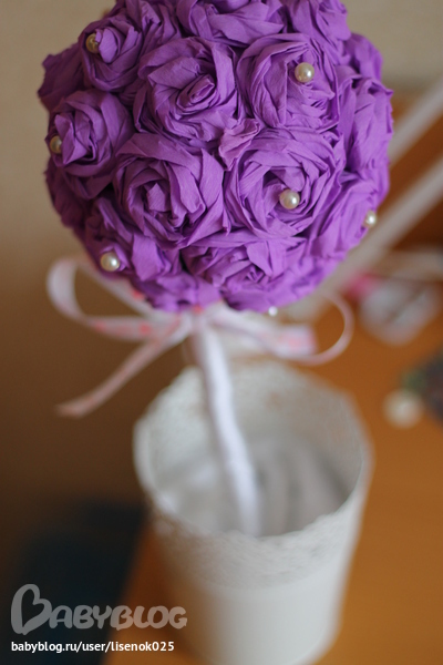 Ой, я у вас в гостях))) в дневнике зачиталась)))) Так интересно) А делала очень просто, палочка, ствол нашла на улице. Шар основу сделала из скотча и бумаги, последний слой из зеленой гофрированной бумаги. Шар посадила на клей на палочку и в цемент, в горшок. Через 15 минут уже сидела с пистолетом, крутила сразу розочки и клеила. Тренировалась долго, часа 2, пока не стали получаться розочки. Причем поняла, что лучше получается, когда скрутила и сразу наклеила. Не знаю, понятно объяснила?))) Я еще 2 недавно для школы делала, вот такой получился