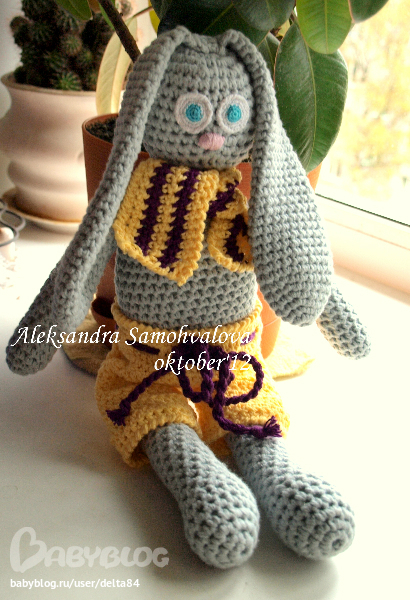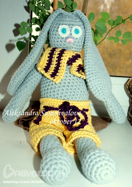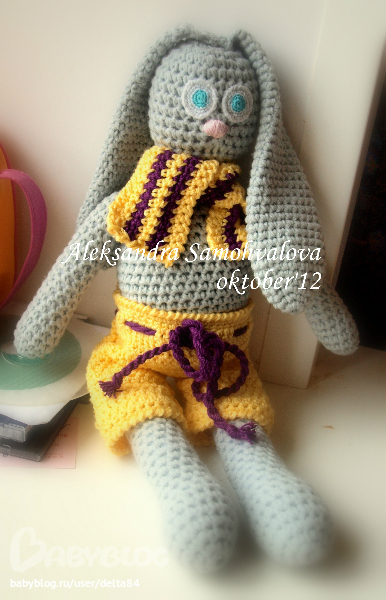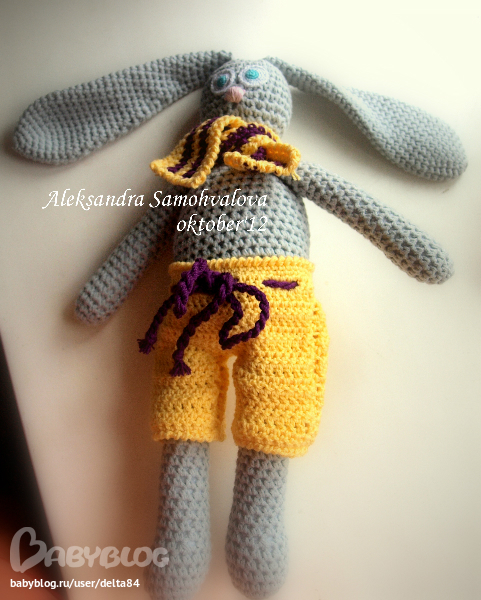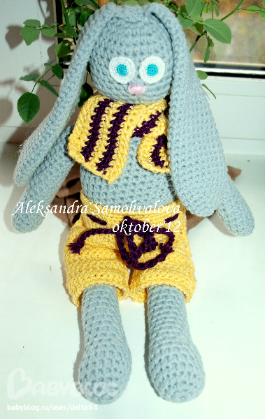 вся пряжа гиппоалергенная и я специально не использовала ничего из мелкой фурнитуры, чтобы заяц был жевательно-сосательно-безопасным))))