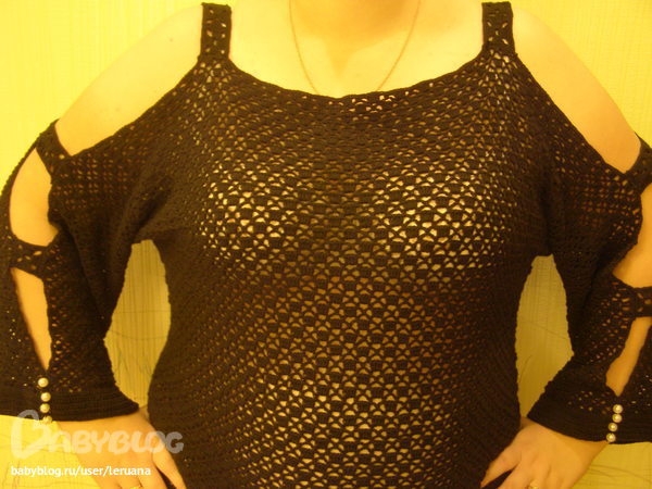 вязка очень аккуратная,но мне кажется,вам такой рукав не идёт. У вас плечо круглое,покатое,как правильно сказать-незнаю. Вам бы наооборот плечи прикрывать. Да и большие части рук открыты,тож как то не то,уж простите=)