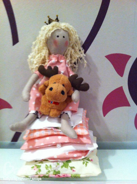 Сшила третью свою тильду. На этот раз принцесса на горошине. Шила для племянницы, чтобы играла и переодевать могла, но потом подумала, что эта сидит и неудобно ее переодевать во что-то. Лучше сошью ей просто фею и много платьев) Моя Полли прекрасно подошла в интерьер нашей спальни, поэтому остается дома! В руки ей сошью позже сердечко или мишку.