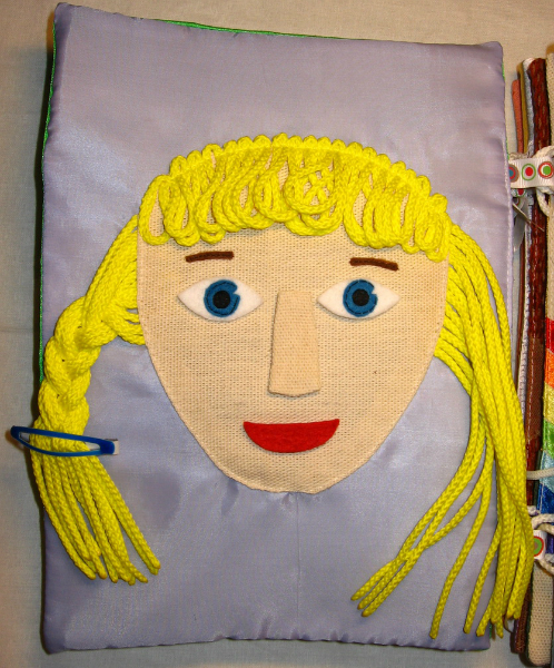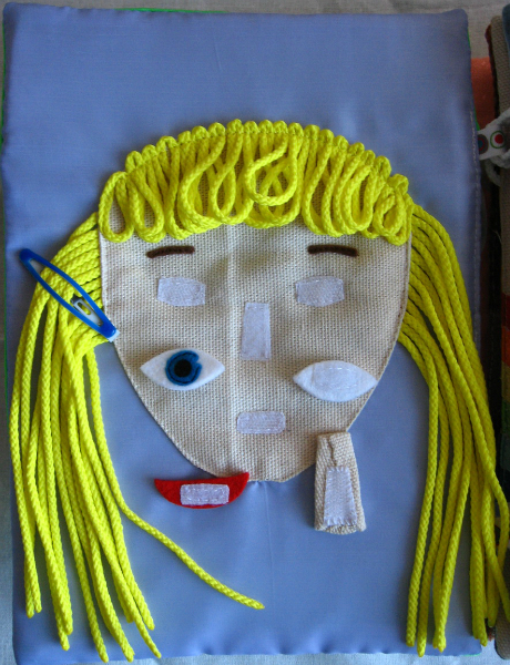 Лицо девочки, волосы выполнены из шнура - можно закалывать или заплетать косички. Части лица на липучке. Сумочка для девичьих заколочек-резиночек, застегивается на кнопочку.