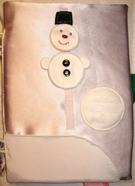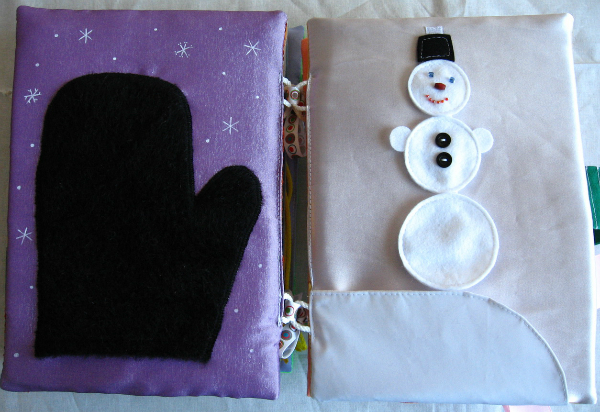 Сенсорная варежка и снеговичок на липучке - собирать от меньшего к большему или наоборот. Сугроб хрустит, выполнен в виде кармана - можно прятать секретики. Снежинки нарисованы акриловой кпаской для ткани.