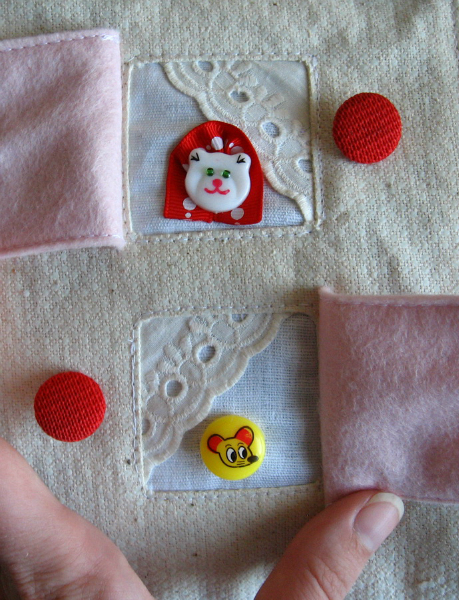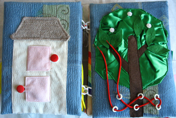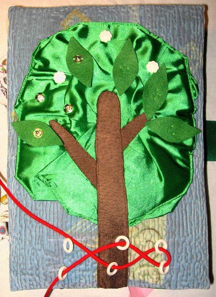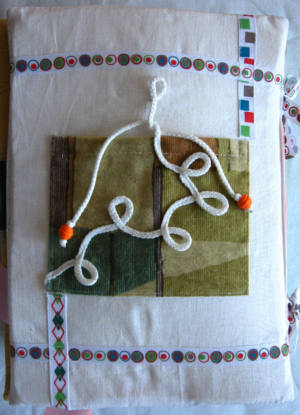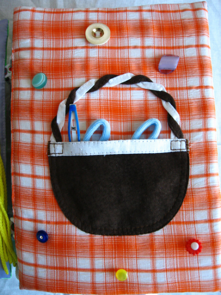 14 стр. - обложка. Карман для всячины с лабиринтом из шнура. По нему водить пальчиком, петельки не пришиты - в них также можно просовывать пальчики.
