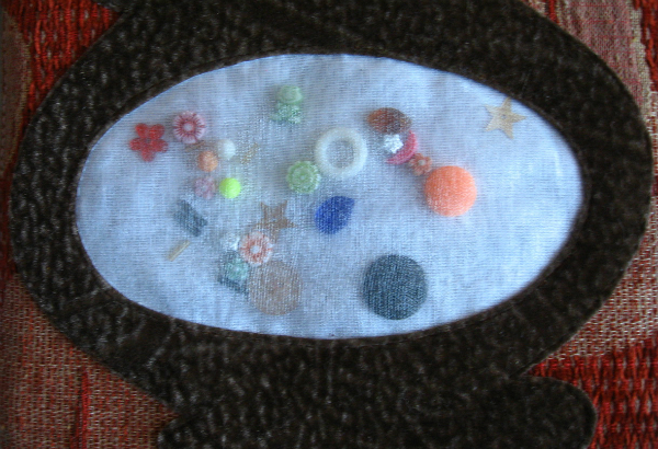 Начинка "лужи" - бусины в виде цветочков, две бусины-листочка, месяц, бусина-лягушка, шторное колеко, три пульки, две пуговицы, одна плоская бусина, две пайетки в форме звездочки, стеклярус, 2 бусины-звездочки.