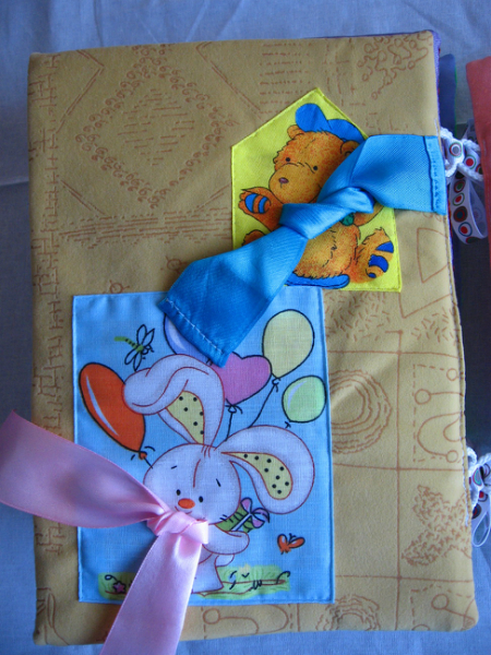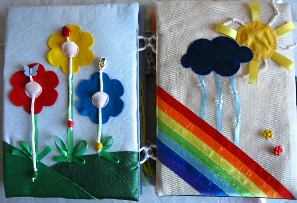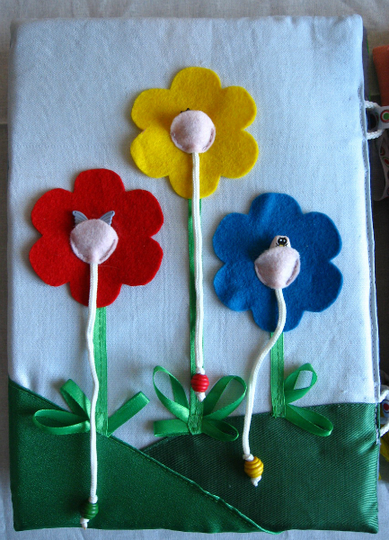 Цветочки - изучаем основные цвета - красный, желтый, синий и стебли - зеленый. Серединки цветов пришиты на половину, в них прячутся насекомые - бабочка, божья коровка и пчелка. 7 стр - тучка шуршит, в солнышке вшито 5 пулек, радуга - изучаем основные и дополнительные цвета, бусинки-дождинки двигаются вверх-вниз. Для детей постарше можно рассказать о преломление света в каплях воды, в следствие чего возникает радуга