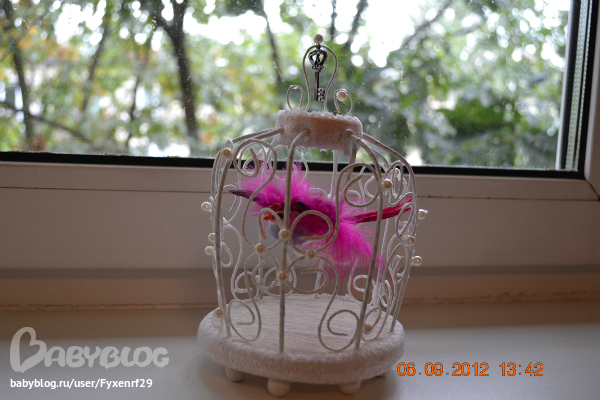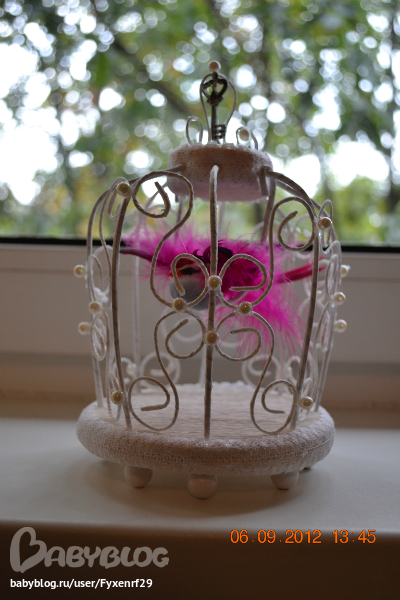 Спасибо, девочки. Борисовна, делается она не сложно. Дно и крыша-это пенистерол (утиплитель), а стенки клетки-проволка для герберов. продается в цветочных магазинах. Все обклеивается гофро бумагой(цветочной, не тонкой) и декорируется. Птичка куплена в том же цветочном магазине