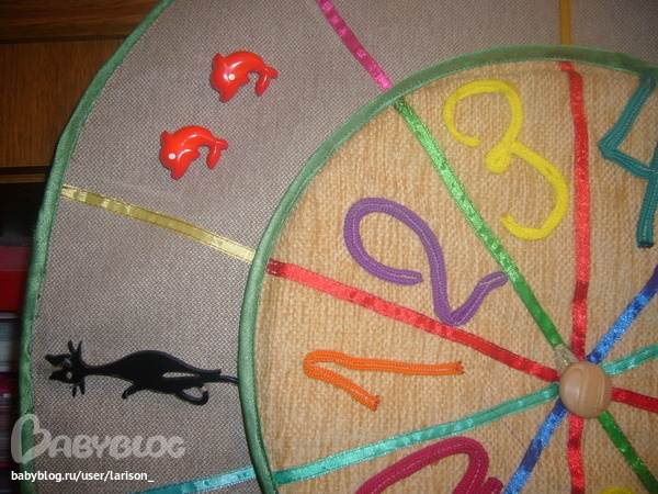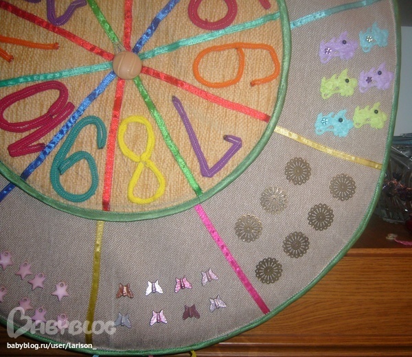 Хочу представить на ваш суд развивающее пособие,которое я сшила для своего малыша.Можно изучать цифры, счет,цвета,формы,время,а также развивает мелкую моторику,тактильные ощущения.Идею видела в интернете.Вот мое воплощение.Состоит из двух дисков,Верхний диск крутится так как крепится на пуговицу.