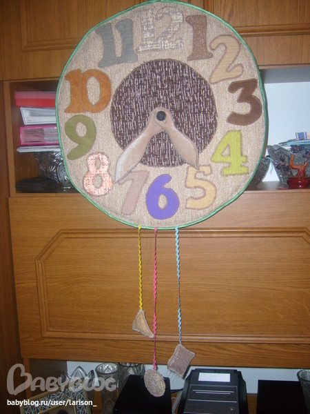 Стрелки крутятся,так как пристегнуты на пуговицу.Внизу висюльки для изучения геометрических фигур (круг ,квадрат,треугольник).