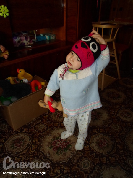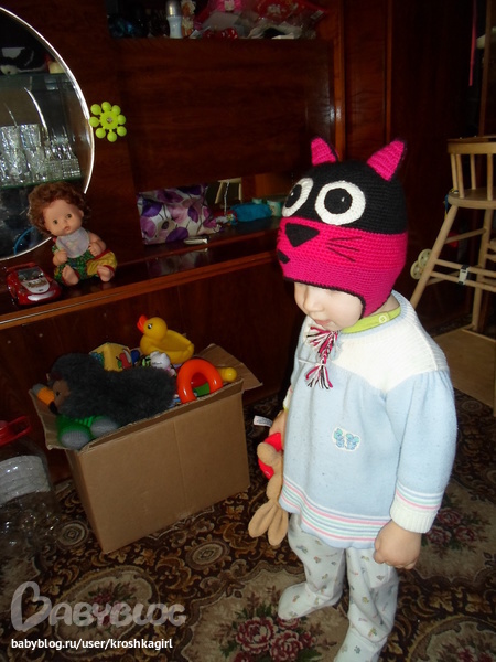 Связала я своей доченьке ещё в сентябре шапку. Вязала шапку я в первый раз и перевязывала несколько раз. Результатом я довольна, всем родственникам тоже нравится, а главное нравится РЕБЁНКУ! Как увидела сразу пальцем тычит и говорит "Кися". Несколько фото.