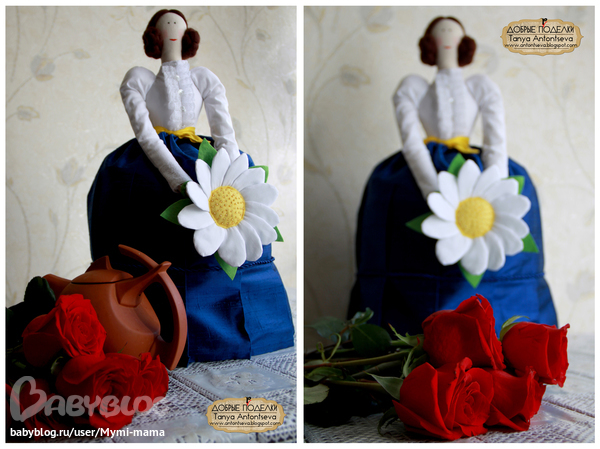 Дама высокая, около 50 см, юбка диаметром примерно 25 см, подойдет как для большого так и для маленького чайника.