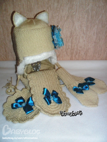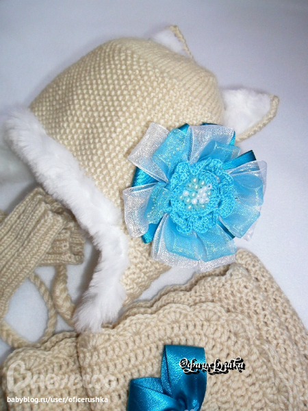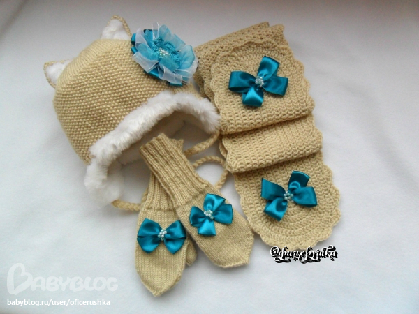 пряжа vita unity, 48% шерсть, 52% акрил. ушло 3 моточка по 100 гр. шапка и варежки - спицы, шарф крючок. шапка утепленная искуственным мехом. отделка ленты атласные и капроновые, бусины. цветовая гамма пожелание заказчицы - под бежевые штанишки и голубую курточку.