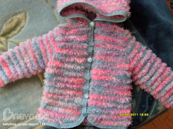 Думала куда бы использовать травку из старых запасов - и вот нашла применение. Купила микрофибру голубого и розового цвета и вот связался целый комплектик. Еще и на курточку хватило.