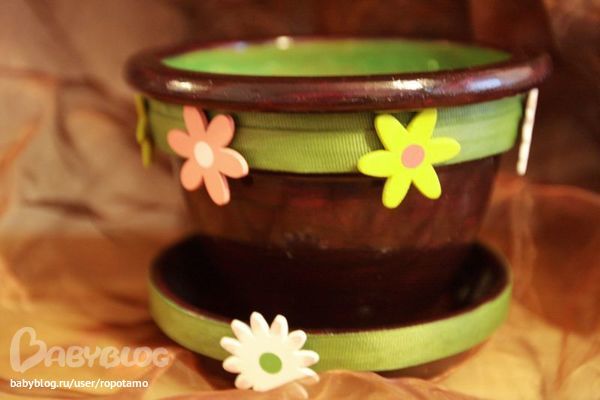 Сначала очистила горшочек с помощью средств от известкогового налета и ножа. Просушила, покрыла грунтом, затем краской. Чтобы перекрыть терракотовый цвет, фиолетовую краску положила в 3-4 слоя. Под тесьмой у меня была зеленая краска (видно на внутреннем ободке горшка), ее пришлось класть в 6-8 слоев, чтобы перекрыть цвет горшка. Но при обжиге она стала пузыриться (много слоев?), пришлось закрыть тесьмой. Тесьму крепила при помощи клея для декупажа, затем покрыла шелковистым лаком. Цветочки клеила супер-клеем Момент.