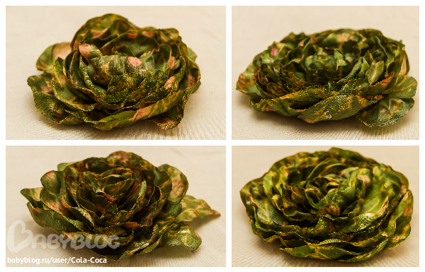так и не поняла что за материал, на бирке написанно, что это 80% шелк, но по моему это жуткая синтетика ) каждый лепесток пришлось опалить над свечкой, но у меня руки не из того места и потом я все лепестки пробулила ))) Есть полжительные моменты у этой ткани - она вооообще не мнется! пока не намокнет.