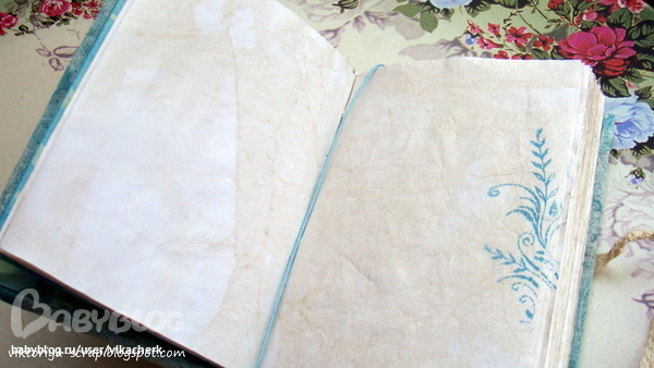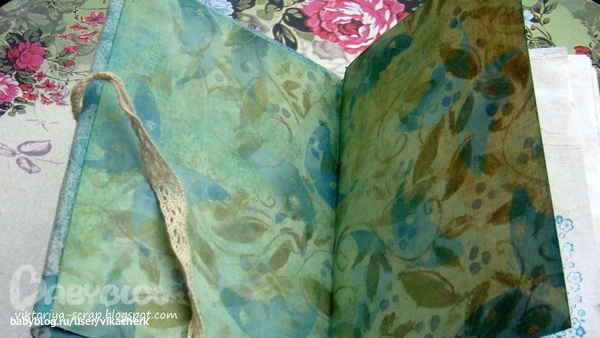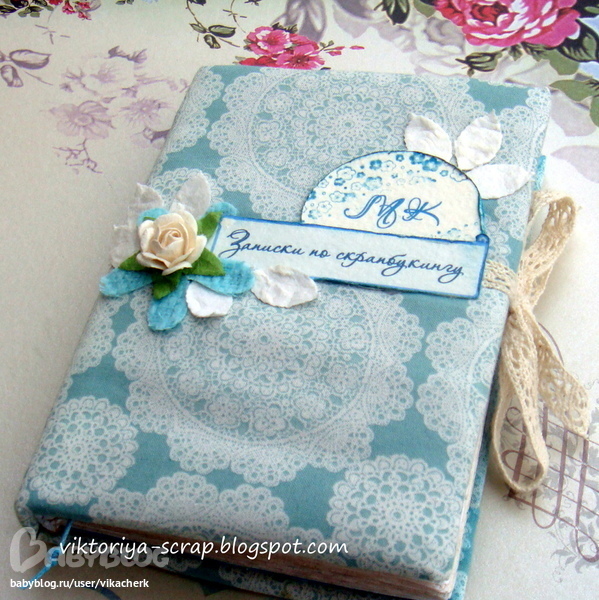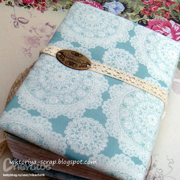 Формат блокнота А6 (люблю миники). Обложка тканевая (тканюшка тоже долго ждала себе применения). Листочки состарены (их в блокнотике более 80) и некоторые из них проштампованы. Завязывается на хлопковое кружево.