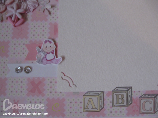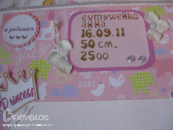 белая подложка под фото, а в середине графики роста, веса и зубики малышки.