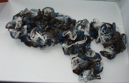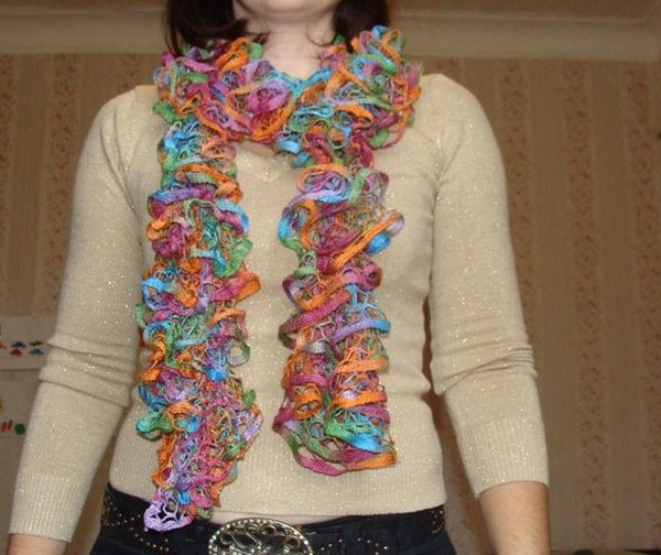 Ленточная пряжа - это как бы лента кружев, из которых вяжется шарф. Это спицами я вязала. Очень просто.