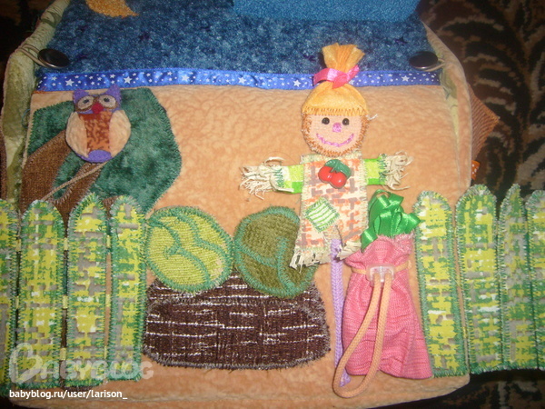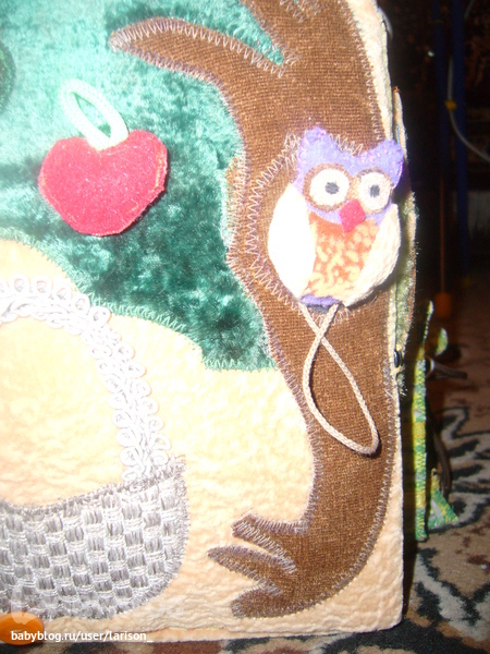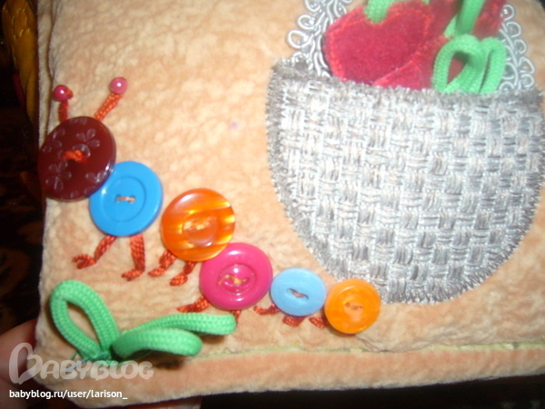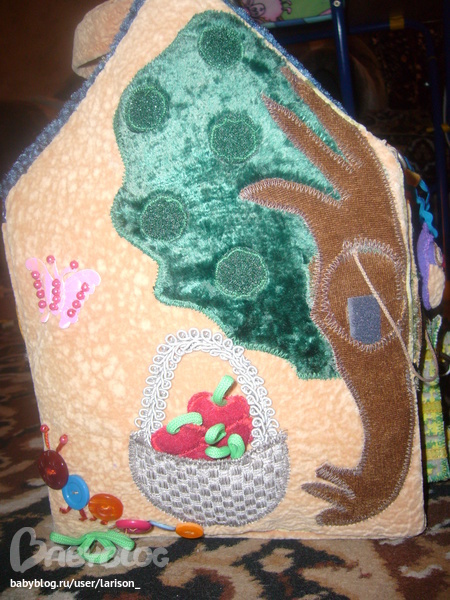 на третьей стороне-дерево с яблочками.Их можно посчитать,а так же собрать в корзинку.Яблочки на липучке.Внизу приползла гусеница из разноцветных пуговиц.