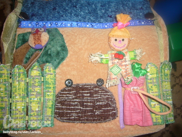 Внизу травка,просто пришила кромку от зеленой ткани,на ней поселился симпатичный ежик,на спине яблочко-пуговица.Цветок полностью не пришит,из него вылетает бабочка на веревочке,можно дергать туда-сюда.