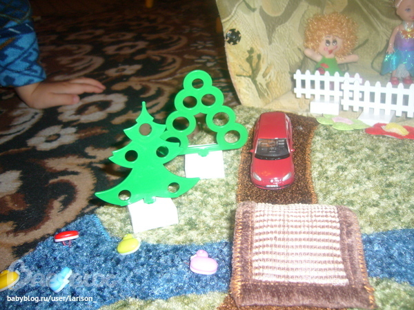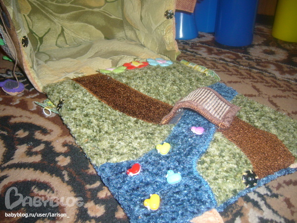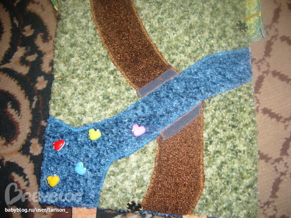 Здесь у нас река, в которой плавают утки-маленькие пуговки разных цветов.Эх ,хотела кораблик еще сделать с якорем,да места не хватило,ну да ладно.А так же у нас здесь дорожка или тропинка.