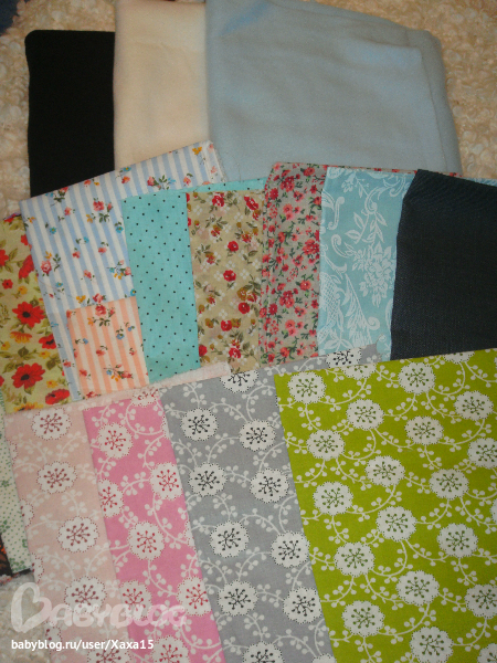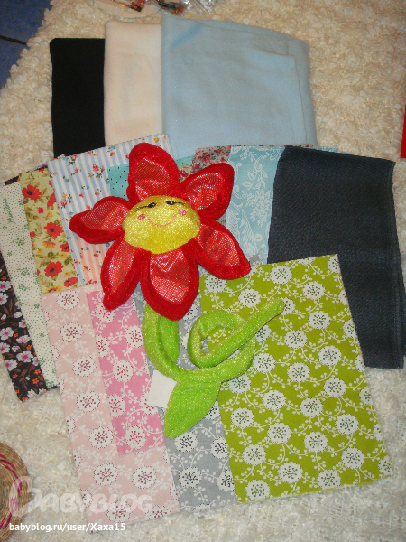 Мягчайший флис (я такого не встречала) и клевые тканюшки, цветочек из ткани (дочь его тут же утащила)))
