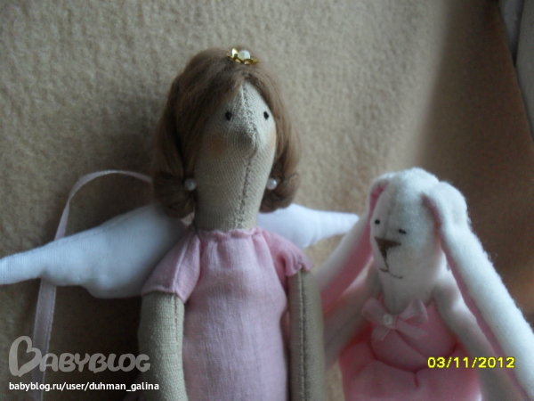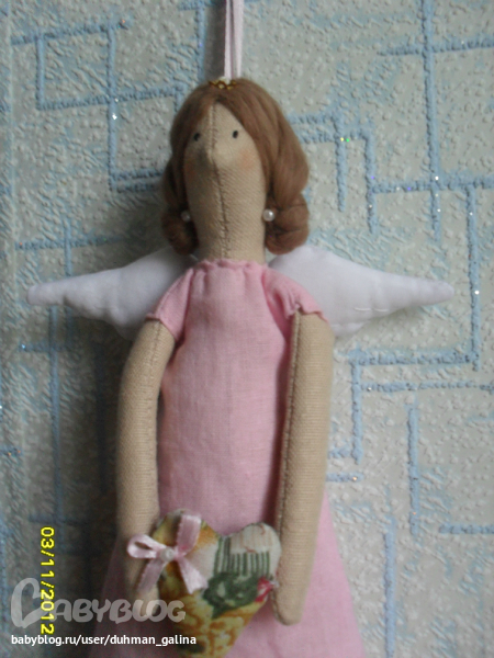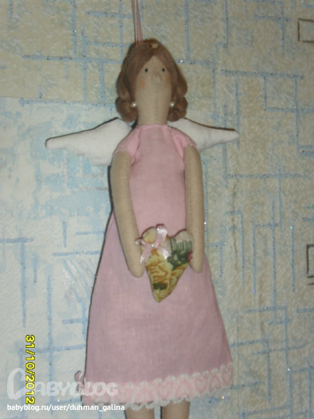Вот какое чудо у меня получилось. Это моя первая пробная Тильда, еще ватой набитая, из подручных материалов. На ней тренировалась делать прическу-вот, что получилось! Не судите строго!))