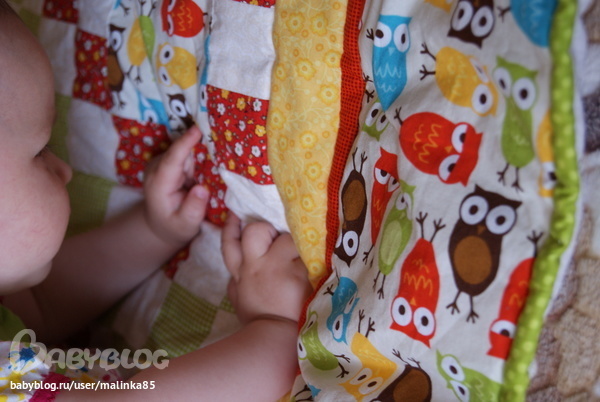 Доча разглядывает совуний.Судя по фото- Вы ходили на курсы по пэчворку???Давно мечталось что-нибудь в технике пэчворк сотворить, но у нас и поучиться не где.