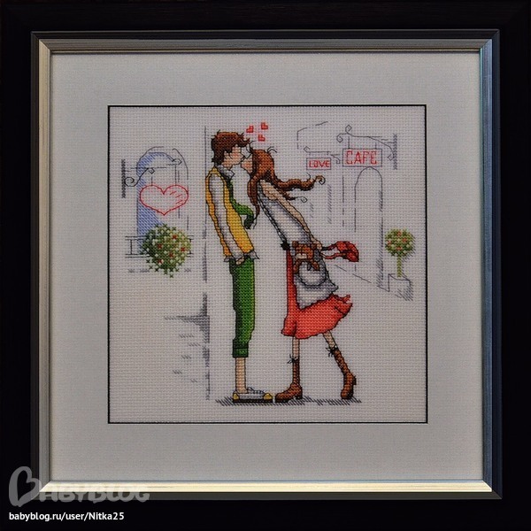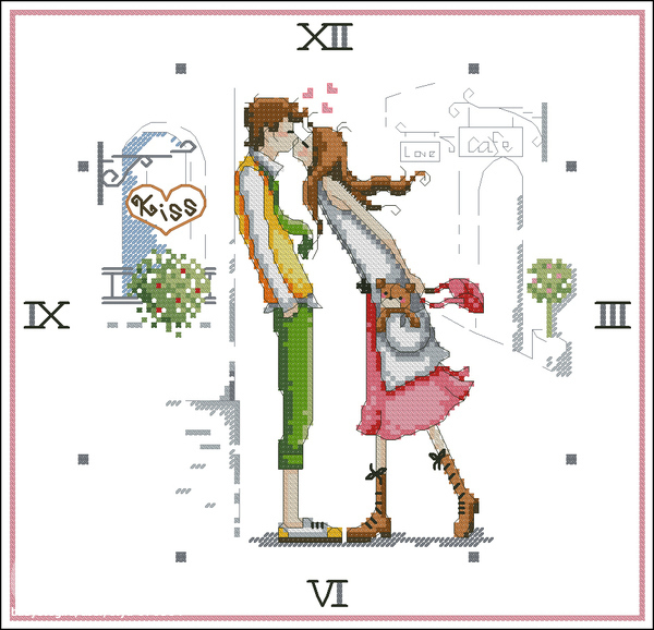 Нам тоже кажется, что стоит располагать вышивку по центру. Конечно, один раз в час поцелуй будет ненадолго закрыт минутной стрелкой, но ведь влюбленный часов не наблюдают :)