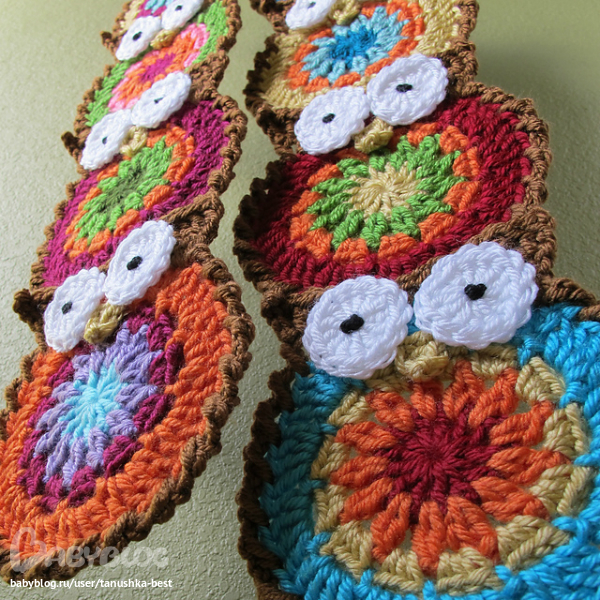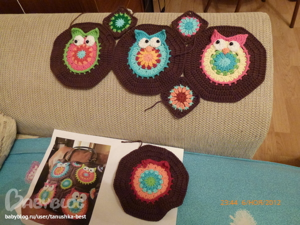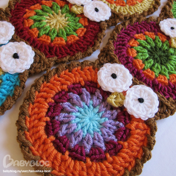 квадратик. опять же 9ссн у меня не хотят лежать, я вязала 12,24, и третий ряд как и в сове, потом коричневй нитью изменяла схему, так как 40 петель не получается.