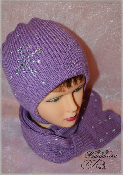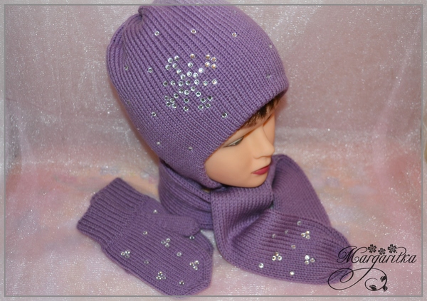 Комплект из шапочки, шарфика и рукавичек, украшен приклейными стразами, помпоны на шапочку и шарфик заказчица сделает сама