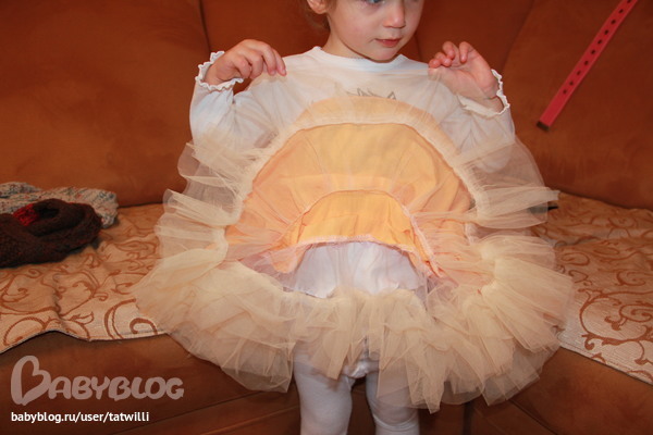 Спасибо! Нет, юбка совсем не солнце верх кокетка (один метр общая длина) - там, где с резинкой, а к кокетке я пришила юбку - татьянку (2 метра длиной), Работала по этой схеме, немного переделав размеры и я не стала делать самые мелкие рюшки, вместо этого сделала 4 самых нижних ряда . Фатин очень мягкий.