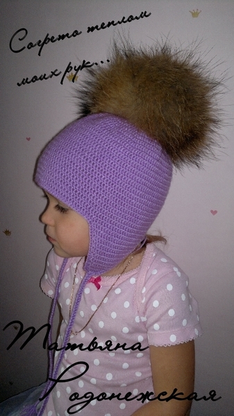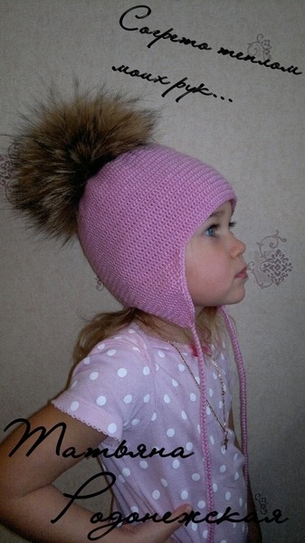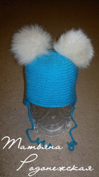 Шапочка на ОГ 50, связана из Мерино де Люкс, крючок № 2 помпон мех енота